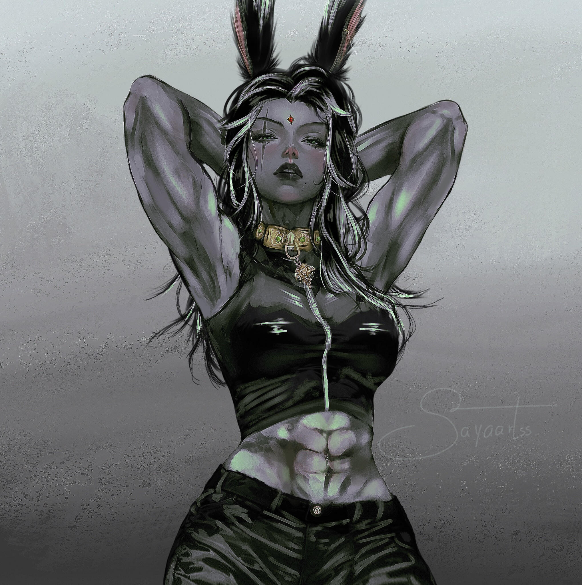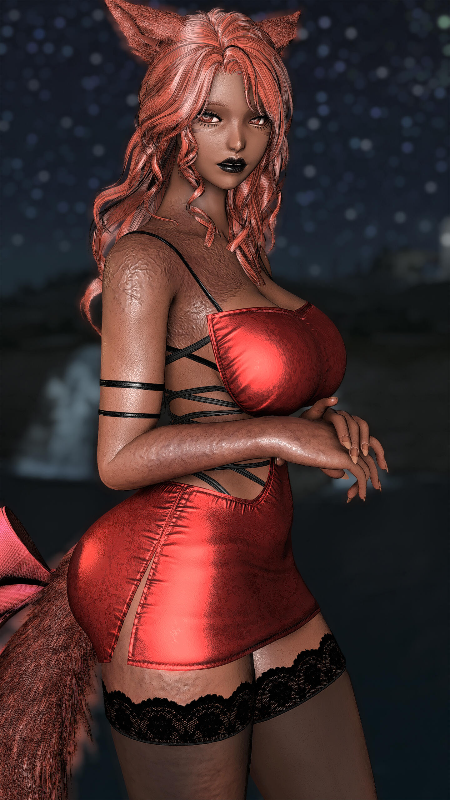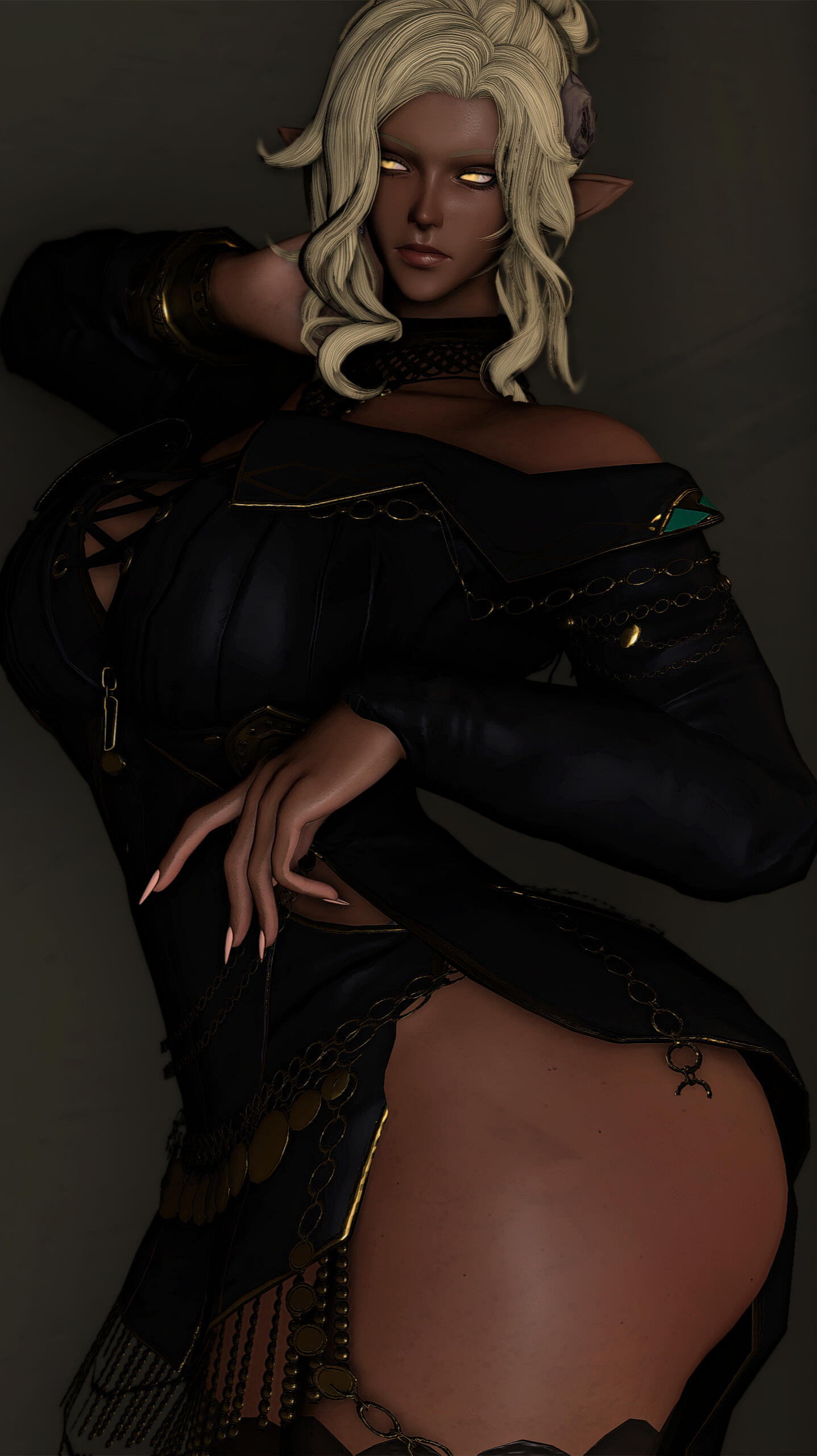Queen was not born into cruelty. Her earliest memories were quiet ones: her mother singing softly in the hours before dawn, low lullabies meant to tame the dark and ease her into sleep. They cooked together, trained together, shared warmth by the hearth and the certainty of a bond that felt unshakable. The Matriarch of their tribe was revered by all, but to Queen she was simply mother, a woman of discipline, strength, and care. The change came slowly. There was no moment to name, only the quiet absence of what had once been there. The lullabies faded. Correction hardened into punishment. Affection became conditional, measured not by growth but by endurance. Queen grew quickly, towering over her peers while still young enough to believe suffering had purpose. Her strength ceased to be nurtured and began to be shaped. Her mother was no longer raising a daughter, but forging a successor. The marks left on Queen’s back were not mistakes; they were lessons meant to last. The cruelty was never absolute. There were still moments of softness, a rare smile, quiet praise, a hand brushing her hair aside. Those moments were enough to keep Queen hoping, enough to make her endure without resistance. Hope, she would later understand, was the most efficient form of restraint.That endurance fractured the morning a stranger screamed at her in a field. The girl accused Queen of stealing her sister, of taking her, of hiding her away. Queen dismissed it as grief misdirected, until she heard something in the girl’s voice that did not sound like confusion. It sounded like certainty. When Queen returned home at dawn, she heard her mother singing again for the first time in years. The old lullaby was unchanged, familiar enough to hollow her out rather than comfort her. She followed the sound into the Matriarch’s chamber and found her mother seated on the floor, bare-skinned and bleeding, calm as she sang. Her body was covered in script, ritual inscriptions carved slowly into flesh with a sharpened bone dipped in her own blood. Each mark was deliberate. Each stroke measured. Her voice never wavered. “It must be remembered,” her mother said. “Not with breath, but with flesh.” There was no room left to deny it.: the missing members of the tribe, the fading numbers, the rituals meant to extend their lives by shortening others. The girl’s sister had not been stolen. She had been sacrificed. Queen had not been raised to rule, but to inherit obedience to a will older than memory and older than blood.Queen confronted her mother. There was no struggle and no defence. The Matriarch welcomed the blade. “You already are me,” she said. Queen struck once, cleanly. Mercy and execution shared the same motion. She buried her mother with her own hands. The tribe did not stop her. They watched in silence, afraid not of what she had done, but of what remained in her place. Queen offered them nothing. She left with the axe her mother had once placed in her hands and did not look back. The girl remained. She did not scream, beg, or curse her. She looked at Queen and recognised what the tribe could not: that Queen had been shaped by the same cruelty that took her sister, that survival did not absolve her, but neither had it made her willing. The girl did not forgive her and did not ask for repentance. She named nothing. She simply saw her clearly. That recognition did not wound Queen, and it did not save her. It stayed with her because it was accurate.Time passed, and the world began to fail. Light crept across the land of the First, not as salvation but as erasure. Night vanished. Shadow thinned. Entire regions were swallowed by radiance that stripped form and will alike. Queen watched it advance without prayer or protest. She did not fight the Flood as a hero, nor submit to it as a martyr. She endured it as she had endured everything else, by refusing to yield meaning to it. When the balance finally shattered, Queen survived where others did not; not through purity nor blessing, but through sheer refusal to dissolve. She watched civilisation fracture, watched light consume what memory could not preserve. When the Flood was at last halted, the First that remained was wounded and unrecognisable.It was then that Queen followed the whispers of paths between worlds. Not hope, nor escape, drew her onward, but curiosity. The existence of a way out was simply another truth to be tested. She crossed the rift deliberately, through methods better left unnamed, and emerged upon the Source carrying no reverence for the miracle of it. She settled in Ishgard, a city shaped by cold, austerity, and inherited cruelty. It suited her. The climate demanded endurance. The people understood hierarchy. Stone remembered what flesh forgot. Centuries passed. Queen lived far longer than her kind should. She watched wars flare and fade, saints and tyrants wear the same faces across different ages. She never joined them. Her presence alone silenced rooms. She stood just under twelve fulms tall, carved of stone and shadow, her charcoal skin and stark hair marked by scars she never hid. Each one carried meaning. None were regrets.She does not seek redemption. She does not ask forgiveness. She does not believe in absolution. What was shaped into her cannot be undone, and she has never desired that it be. Those who kneel before her do so without instruction. Queen does not discourage it, nor does she reward it. Remaining near her is itself a choice, and one most cannot sustain for long. Obedience is not demanded; it is assumed, and tested the moment it is offered. Cruelty, to her, is not indulgence but function. Through fear, pain, and restraint, she strips away pretence and watches what survives. Many break quickly. Some endure longer than expected. Very few last long enough to be remembered. Connection, when it occurs, does not change her. It exists only as continued presence under full knowledge of what she is. Those who remain do so without i